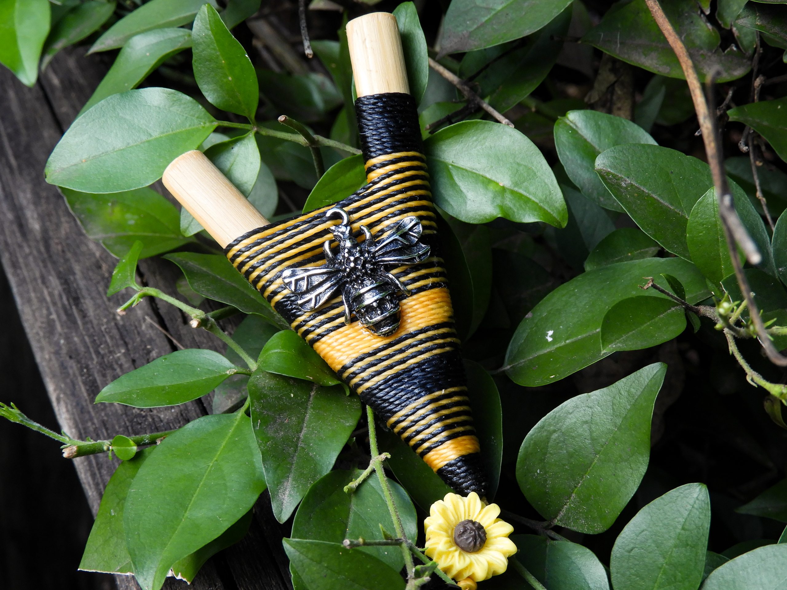 Kuripe feito com bambu tratado, linha encerada, pingentes (abelha / flor) e miçangas pretas.