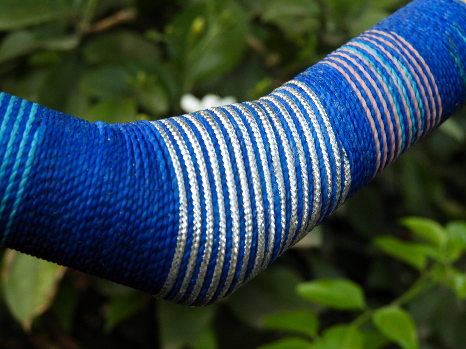 Tepi feito com bambu tratado, linha encerada e linha brilhante na cor prata.