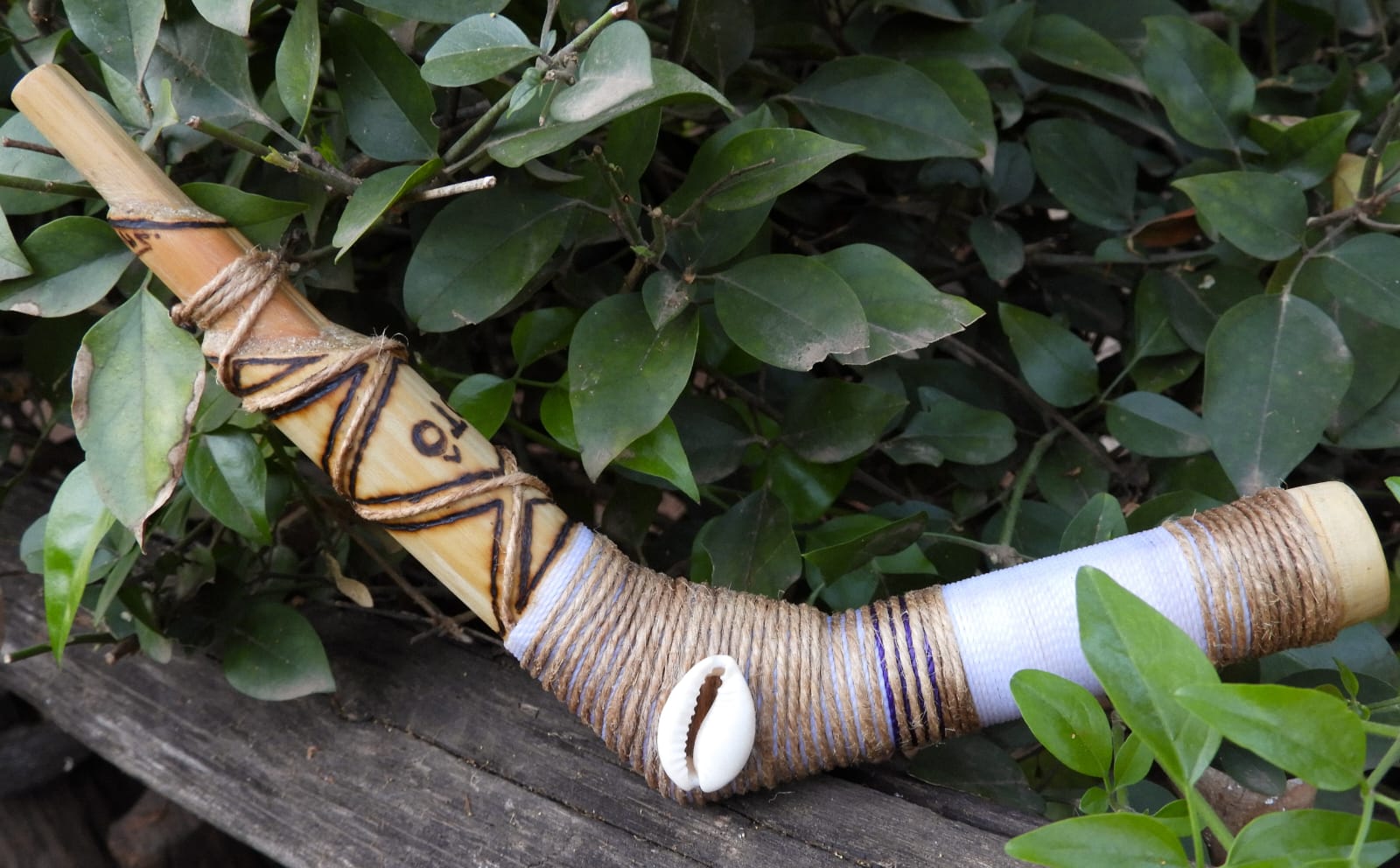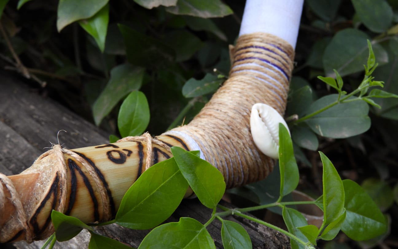 Tepi feito com bambu tratado, linha encerada na cor branca, linha de corda e búzios.